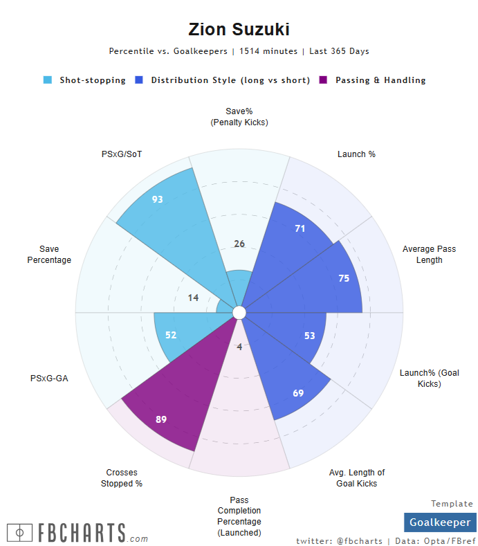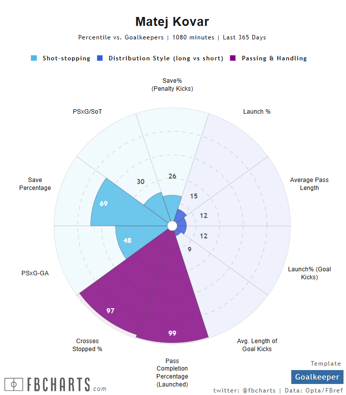 Kovar rates inside the 90th percentile for clean sheets, but the worry is that is PSxG-GA isn’t very high, so he may not cope well if not behind a solid, consistent defence. I have been a major proponent of Kovar all the way back since before he was sold, and would love to see him brought back to the club, as United have a buyback clause they can use.